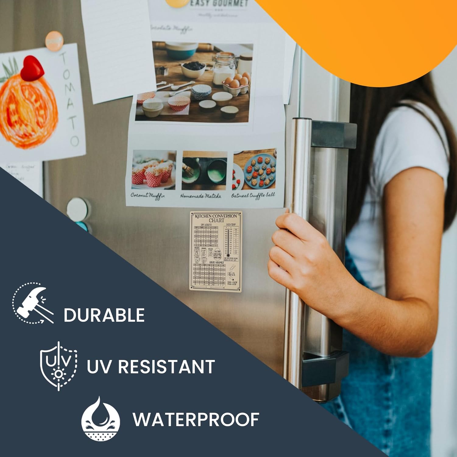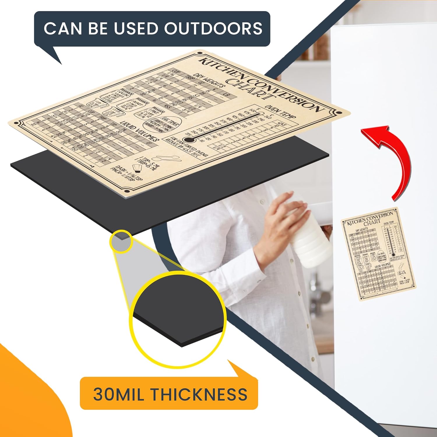 Crafted from strong and durable magnetic vinyl; and are built to withstand daily kitchen use. This ensures that the magnet adheres securely to metal surfaces and will maintain its magnetic strength over time. Our magnets are waterproof, strong and durable, which makes them perfect for your kitchen, garage, etc