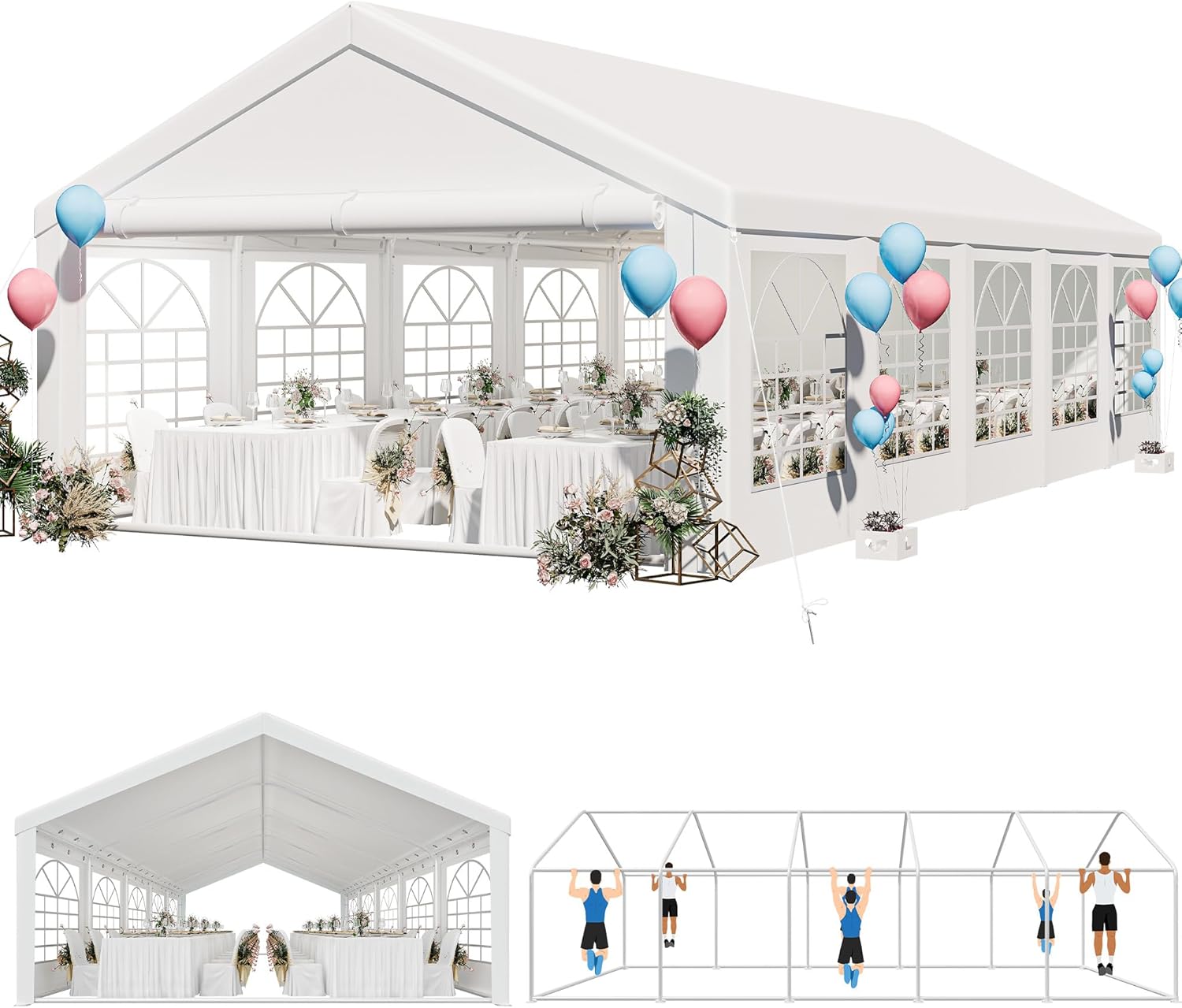 PACKAGE CONTAINS PACKAGE- 3 boxes; Total weight: 293.22 pounds; Including: top cloths *1, sidewalls with windows*2, zipper doors*2, columns, Oxford cloth storage bag *3, connecting parts, 6mm large ground nails*8, pull ropes*8, small ground nails*24; The outer box may arrive in different time periods. Safety measures and professional installation are highly recommended